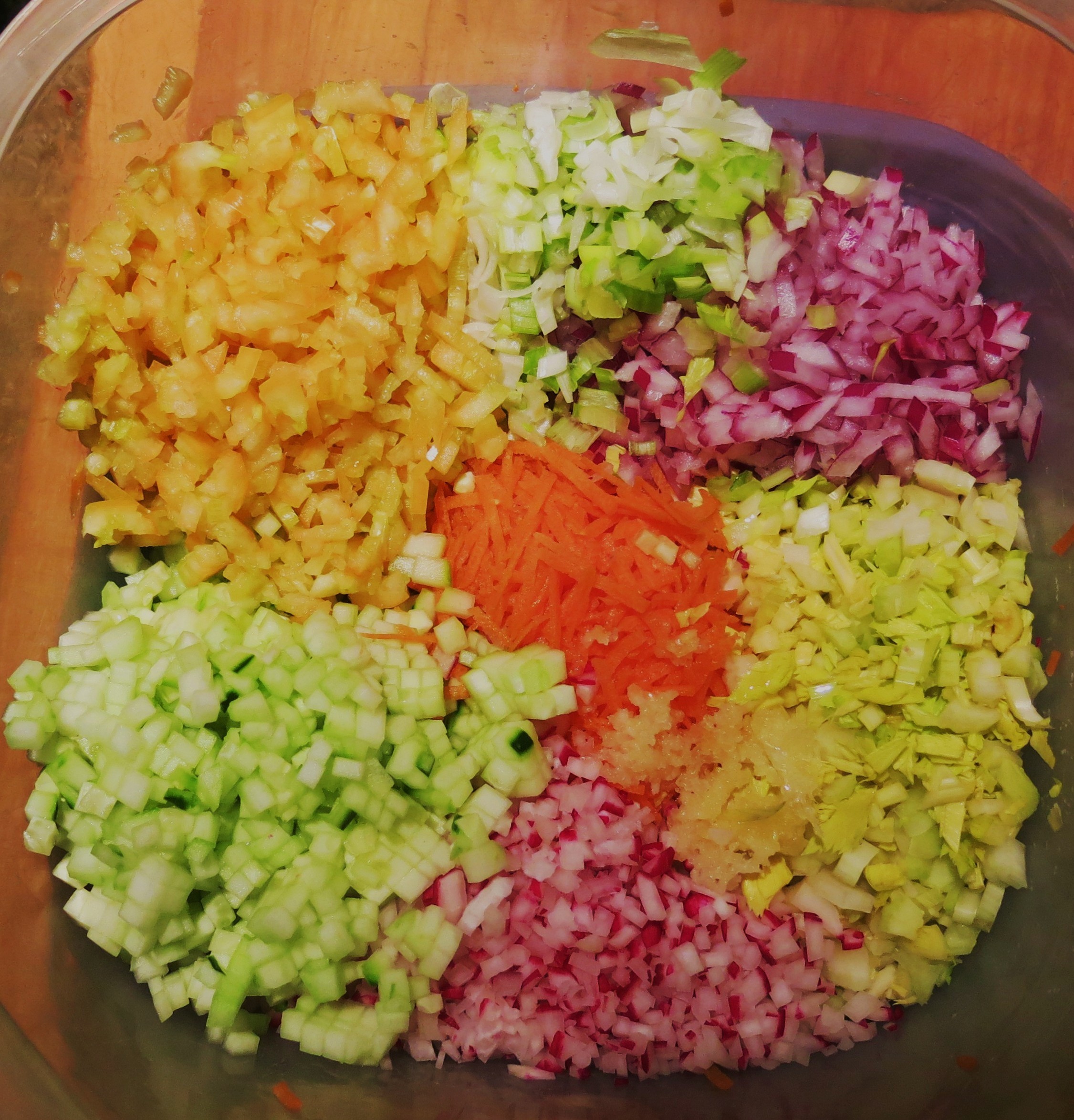 I dice all the veggies, except the tomatoes (I actually do reserve 2 that I dice finely), into a very fine dice. I try to keep the dice the same size, about 1/8-inch dice or brunoise.