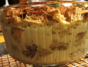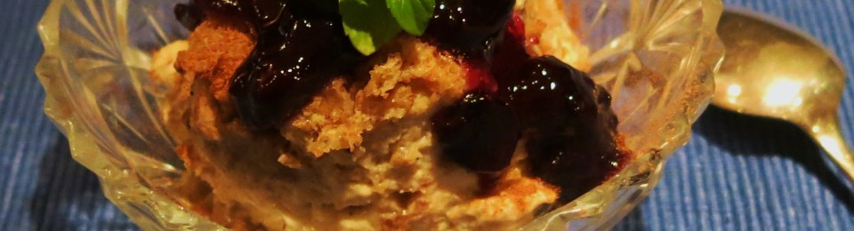 Remove the pudding from the oven (you’ll want to remove the water bath, pour out the water, but use caution because it’s very hot and place the bread pudding on a cooling grate or a cold burner). Cool for at least 30 minutes before serving or completely cool, cover and chill. Serve with whipped cream or crème Anglaise. A caramel sauce is also a nice addition, as this dessert isn’t too sweet.