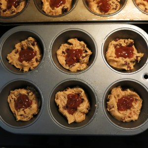 I put a tablespoon of dough in the bottom of each muffin tin. Then a teaspoon of the dulce de leche in the center. I was trying to keep it from running to the edge, because I think it will stick and create problems when you want to remove the cookies.