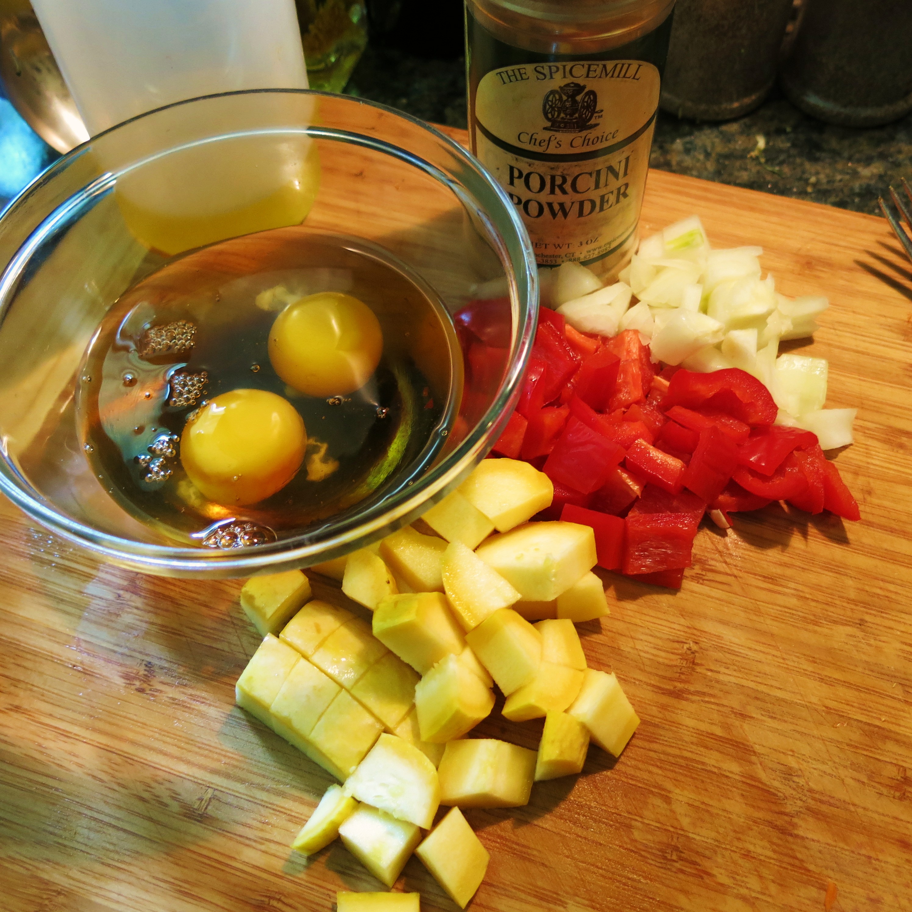 Add the rice; stir to combine. Continue to cook for 3 minutes, stirring or flipping 2 times. You want the rice to brown just a bit. Push the mixture to the sides of the pan, leaving the center bare; about a 4-inch area. Pour the beaten egg mixture into the center; let stand for 30 seconds. Using a fork, stir to remove the cooked eggs from the bottom of the pan, partially scramble the eggs. Repeat 2 more times. They will still be moist and only partially cooked; stir the eggs, peas, if using, and porcini powder into the rice/vegetable mixture, by drawing the rice from the sides of the pan into the center. Even the mixture out by gently shaking the pan. Allow to cook for 1 minute, turning the mixture, even it out and leave 1 more time.