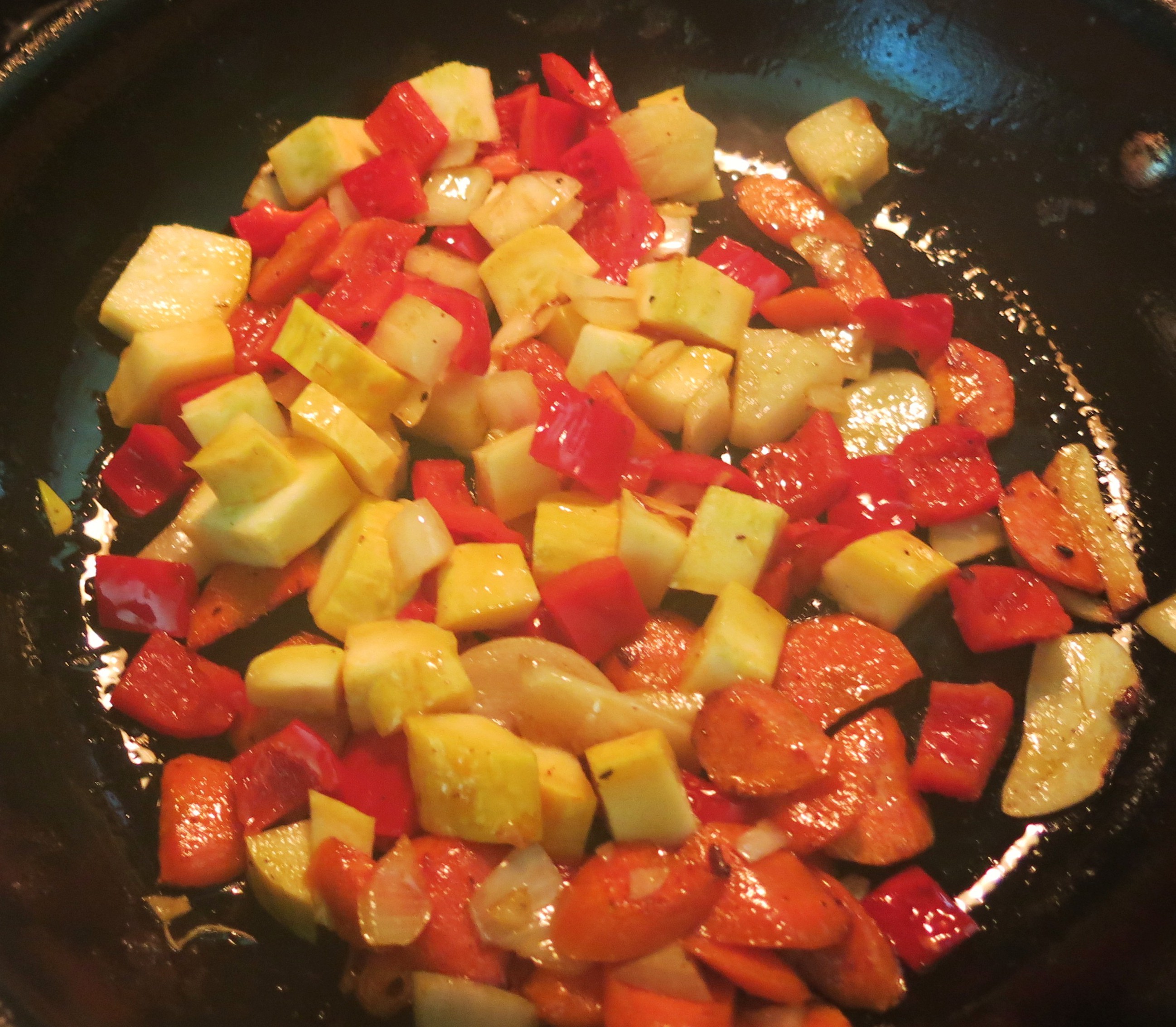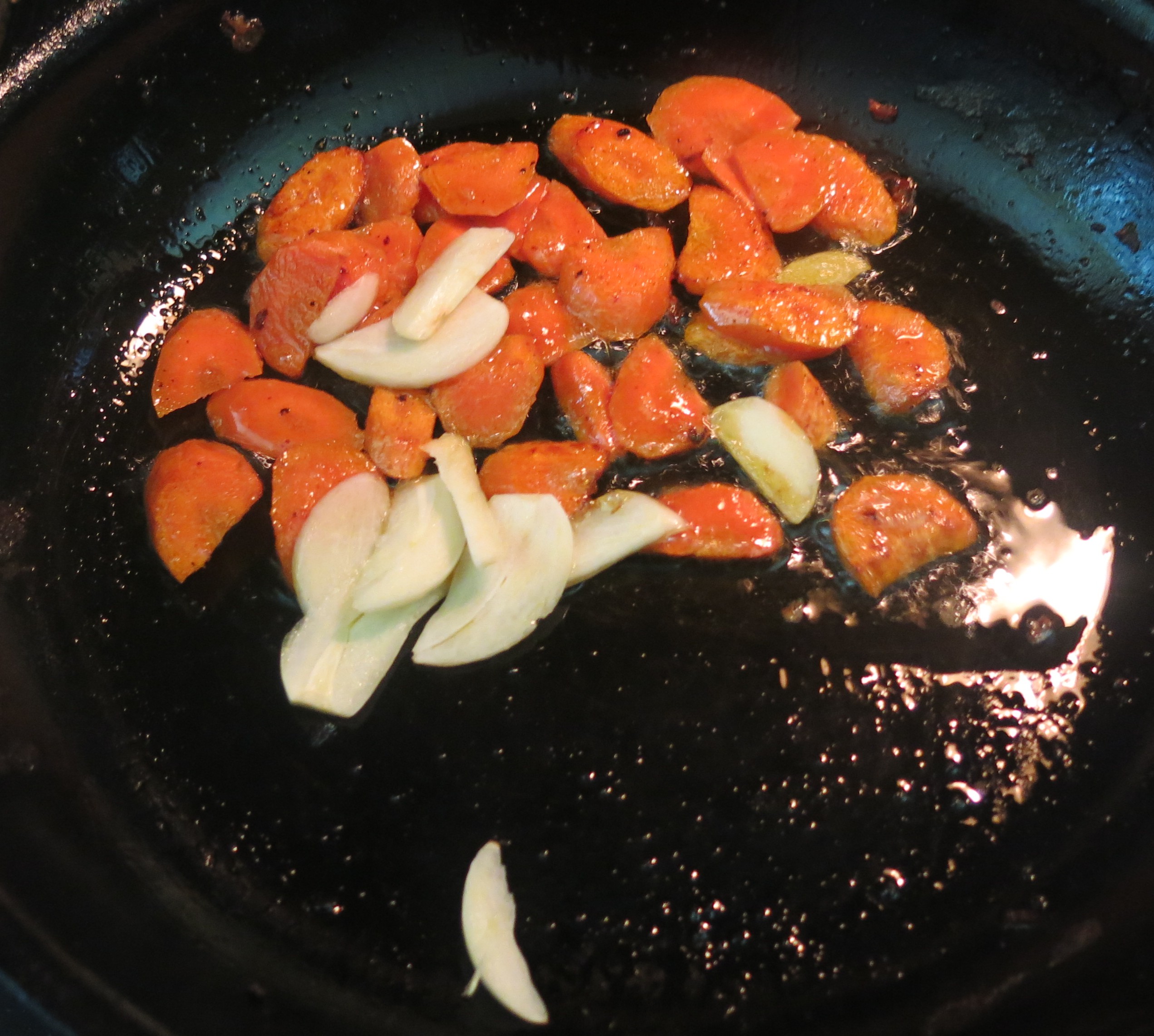 Well anyway, get your skillet nice and hot, toss in your fat of choice. Make certain the fat is hot, then in with the carrots. I usually just flip the pan to move everything around, but I only flip it once or twice because I want the veggies to pick up some caramelization, and they need to do that quickly, about 2 minutes. So hot pan, hot fat and not much movement—will get us the “YUM” factor we want.