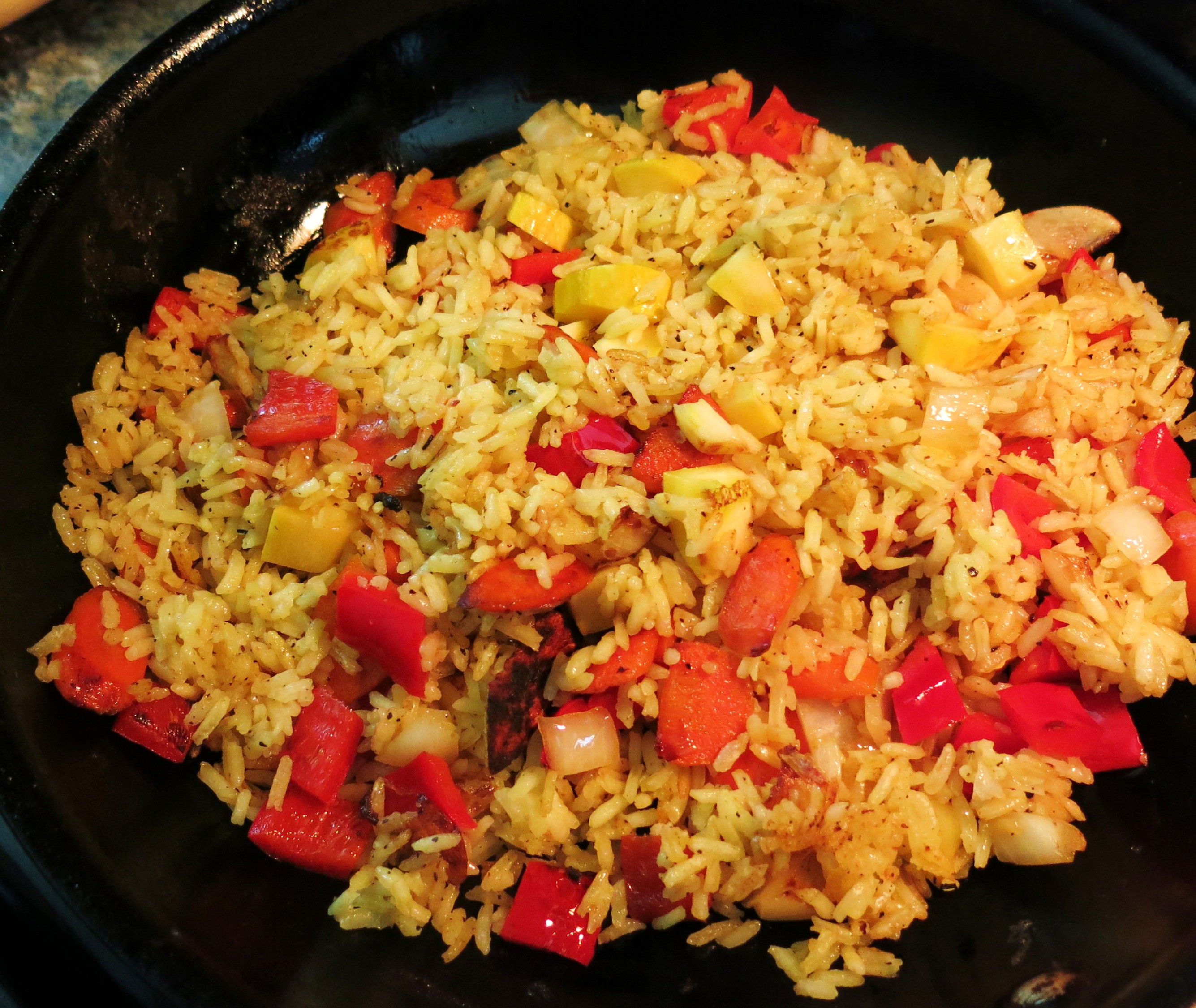 Next, I slice a carrot, dice some bell pepper (I had a red one this time), yellow summer squash and onion (you seriously thought there would be no onion!), very thinly slice 1 or 5 cloves of garlic, get out the cold or cooled rice and my skillet.