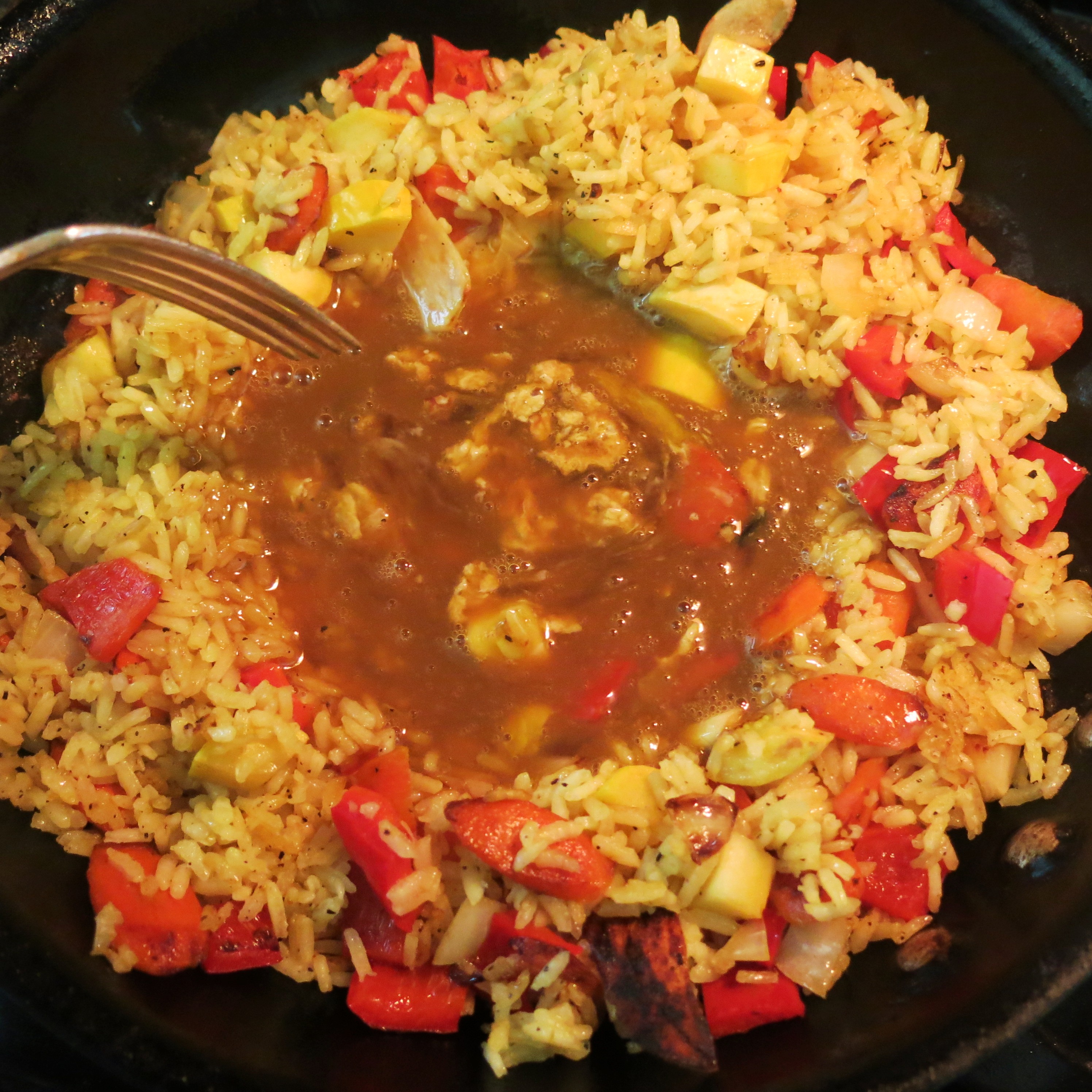 Push the rice mixture to the edge of the skillet making an open well in the center. Then just pour that already-beaten egg mixture into the center. Leave it for 30 seconds,