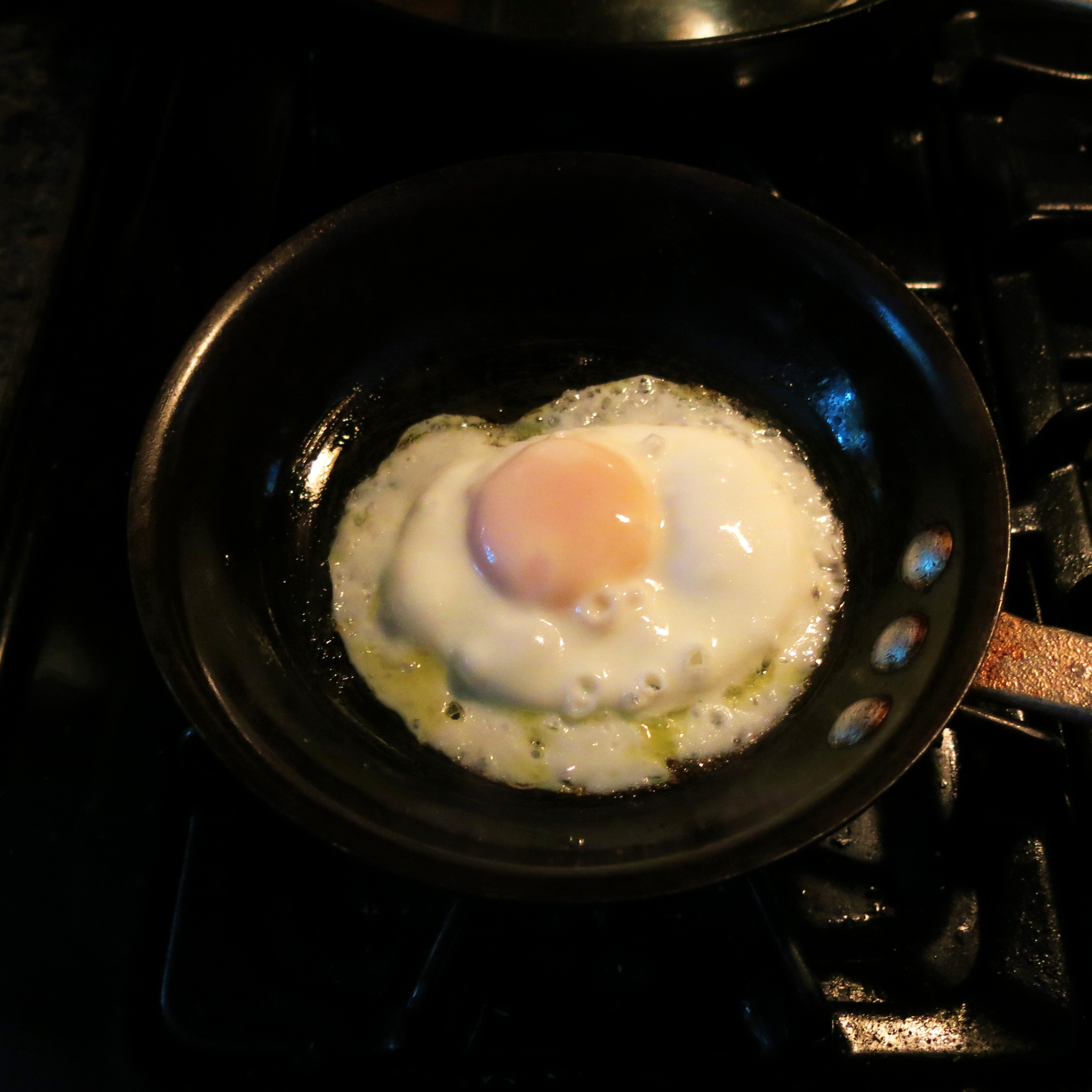 First, begin frying an egg. You can see how to fry an egg perfectly by checking out the post on that. In this case, you don’t need to concern yourself so much with a nice runny yolk. While I do love an oozy, luscious yolk, it really doesn’t change the actual flavor of the sandwich.