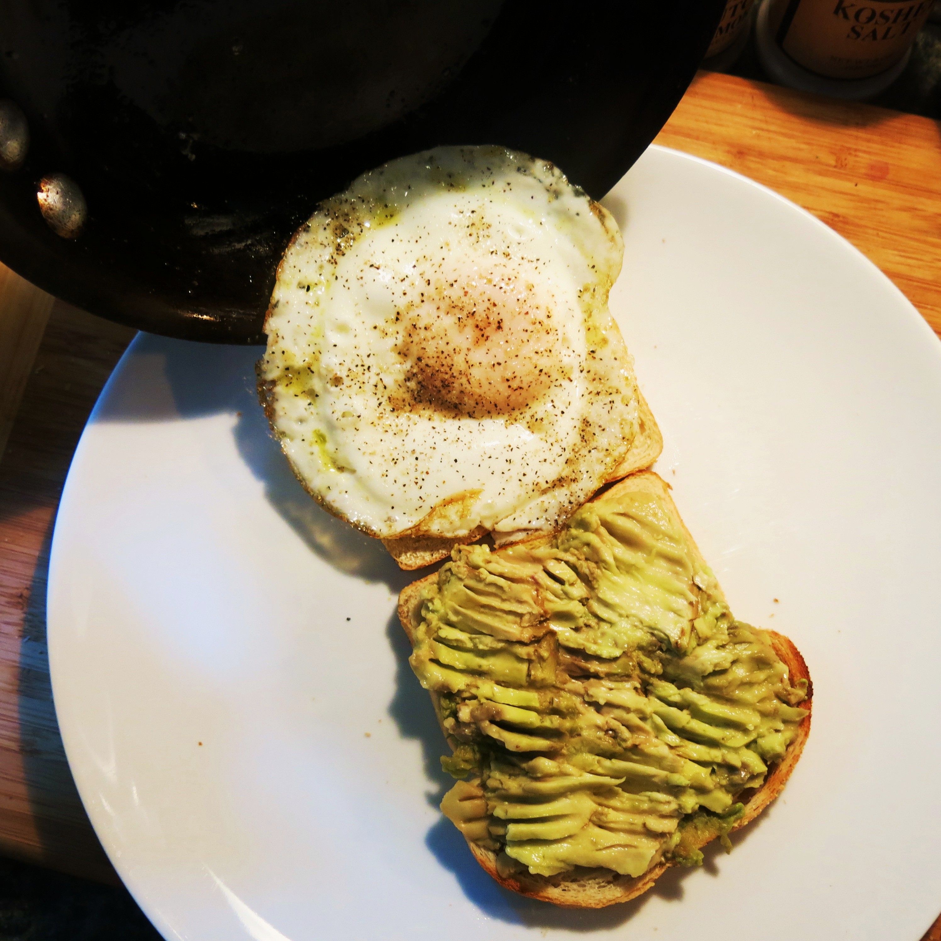 Third, squeeze or slice the ripe avocado onto the bread. Season with salt and pepper. Don’t skip that step or your sandwich will fall flat. We don’t want a flat sandwich. No we certainly do not. Then, slide that egg onto the bread.