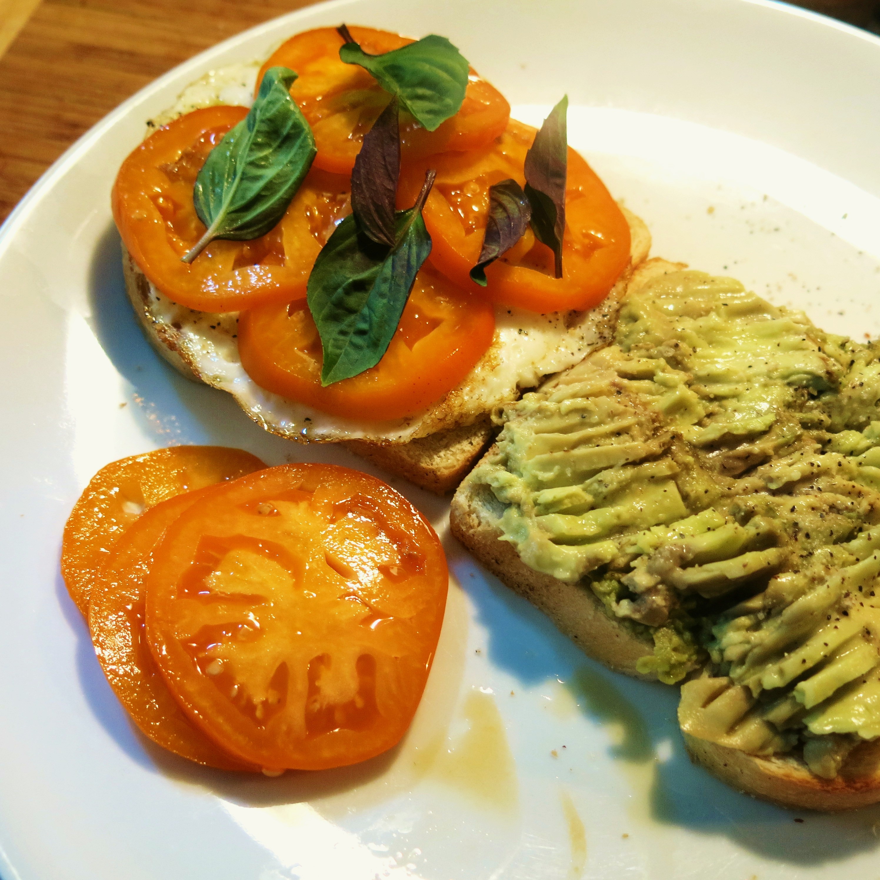 FINALLY, it’s ready to eat. Now, there are those that might like to throw 3 or 4 bacon slices or some ham, or a couple of slices of cheese, on our creation. Put ’em on, if that’s what you want. This is YOUR sandwich. I like those, too, but sometimes a good smoky bacon is better with just tomato. See…The Goddess can be a purist at times, but not here. She wants to taste the avocado, the egg, and the tomato with each bite. As you can see in the pictures, she did toss on a few basil leaves, so maybe she’s not as pure as she lets on. I’ll have to talk to her about that.