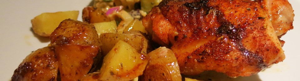 If you don’t wish to roast a whole chicken, I seasoned some bone-in, skin-on thighs and just placed them skin side-up directly on top of the potatoes. It worked pretty well, but of course the bottom of the chicken didn’t brown, but you could put them on a rack, as well. They were still wonderful. I would imagine you could use bone-in, skin-on breasts. When you use pieces of chicken, you’ll need to cook the potatoes until they are at least half-cooked through. Whatever you choose to do, it will be delicious.