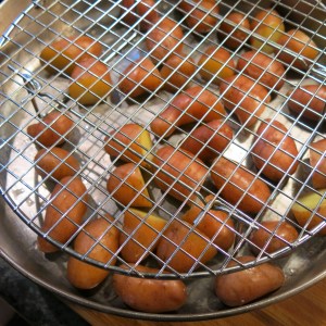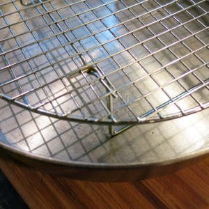 Place the par-boiled potatoes in a deep pan (at least 2 inches deep and preferably one that can go on the burner, but that’s not a deal breaker), and add the broth. Place a cooling rack, over the potatoes,