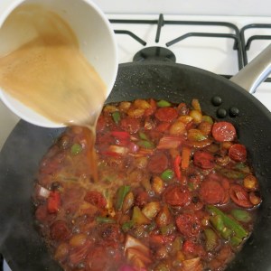 Place the sliced chorizo (or diced ham) in the pan. Sauté until they begin to color slightly, about 2 minutes. Add the onions and peppers; continue cooking until the onions pick up some color, about 3 minutes. Stir in the bay leaf and spices. Deglaze the pan with the wine and coffee. Let simmer for 1 minute.