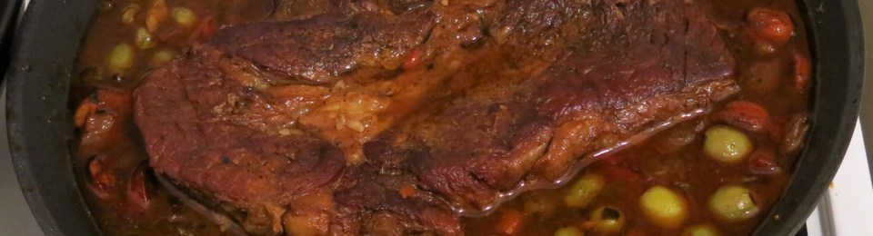 Last year I shared my recipe for one of The Spicy Honey’s favorite dish, Boliche, the Cuban version of pot roast, with cubes of good things stuffed in the middle of it. This isn’t that. Boliche is wonderfully tasty; it is using the eye of the round. But, I have a chuck roast. So why, The Goddess asked herself, not make pot roast, using the same ingredients, just not stuffed into the hunk of meat? This is a very easy meal, but it takes time, as the meat needs to cook ever so slowly until it becomes so tender you can cut it with a fork. I love pot roast and The Spicy Honey loves boliche…so this seemed like a natural “translation” of the traditional dish.