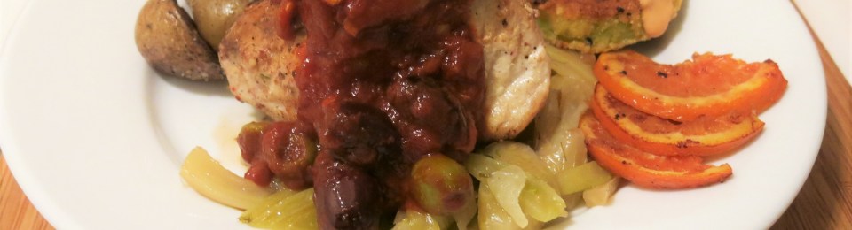 Is this really Sicilian? Perhaps, if The Goddess lived in a Sicilian village she would be making this dish, with many of the flavors—tomato, capers, olives, garlic, orange (there it is again!) and some fennel—that are so prevalent in Sicilian cooking. This turned out to be delicious, so she will be making this frequently. I think the idea for this came to The Goddess when she sneaked out and was wandering around the Interwebs. She ran across this fantastic blog, The View from Great Island, by Sue Moran. It’s great and you should go right over there and take a look. What caught her eye was Roasted Chicken with Allspice and Citrus; Sue oven-roasted sliced citrus with seasoned chicken, which just looked terrific and which will appear on our table in the next little while. It appears Sue and I share a love of citrus…and in this case, allspice, too. When roasted, the citrus slices get soft, but with a caramelized, chewy rind that’s just a textural wonder. You know The Goddess has an ongoing love affair with anything citrus, but oranges are particularly near and dear to her. Yes, The Spicy Honey is aware of this tawdry little affair and has just decided to live with her follies…we sort of have a threesome going here (did she say “threesome”? Shock and horror!!!), as he loves oranges, too! The thing is, citrus adds that spark that helps balance flavors…oranges add that, but a bit of sweetness, too.