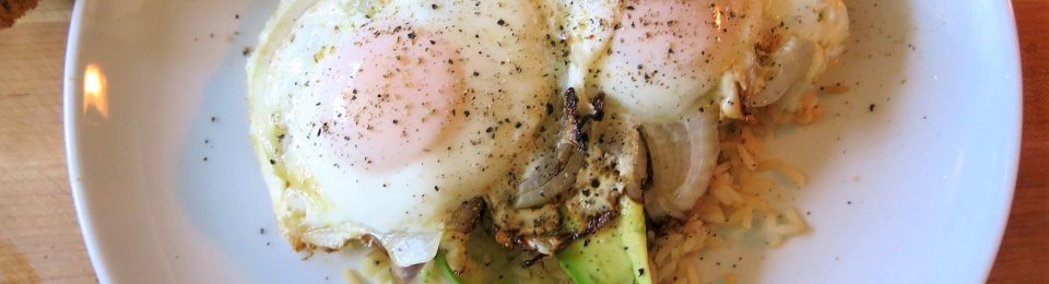Heat the skillet over medium heat. Add the oil or bacon fat and the onion slices. Toss in some sliced garlic cloves, if you want. I had garlic in the rice, so I didn’t do this. Sauté the onion for a minute or two, then push the slices together in the middle of the pan, lower the heat and break one or two eggs on top. Cover and cook for about 1 1/2 to 2 minutes.