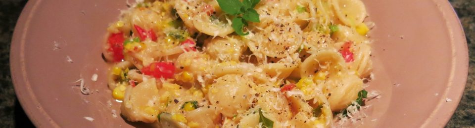 I do love to read The New York Times (NYT). And don’t get me started on their Sunday crossword. The Eldest Progeny and I tend to share that joy whenever he’s around, but every other Sunday, it’s mine. All mine. I am actually getting to a point here. Everyday, the nice people over at the NYT deliver their cooking “section” right into my email. Isn’t that nice of them? Well, this past week they posted a recipe for Creamy Corn Pasta with Basil. It caught my eye because, I love corn and basil together. And, I had a couple of ears of Microwaved Sweet Corn leftover from a couple of days ago, so this is an idea for you to use up leftovers.
