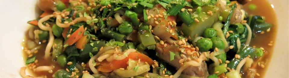 Place the ginger, lemongrass, garlic and broth in a large saucepan. Bring it to a simmer, add the ramen “brick”. Bring the pot back to the simmer and using a chopstick, finagle the noodles apart. Add the flavor packet, coarsely shredded carrot, green beans and sliced gai lan stems. Simmer for 2-3 minutes. Coarsely chop the gai lan leaves; toss in the gai lan leaves and scallions; simmer for 1 minute. Toss in the frozen peas, the shredded, cooked meat (or leave it out completely and go vegetarian), and the tong ho. Turn off the burner, cover and let the mixture stand for about 2 minutes. Stir in the sesame oil and the lime juice. Serve, topped with the jiu cai and sesame seeds. Serve hot.