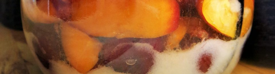 Rum Pot is such a nice gift to give yourself for Christmas. It’s an even better gift to give to your holiday guests. The fruit is wonderful served with ice cream, over pound cake or bread pudding or in a bowl with a spoon…just as long as you’re not driving! Then there’s the liqueur. But, you need to start a Rum Pot in the summer. The idea here is that you’re going to let perfectly ripe seasonal fruit soak and macerate in sugar and rum for at least 6 weeks, but 6 months is even better. Patience friends…patience. The Goddess isn’t good with the patience thing, so she slides the jar into the back of the pantry and tries to forget about it.