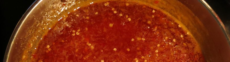 I like to use a combination of peppers. I use those small, sweet colored peppers, with almost no seeds, that are available these days in most supermarkets. They are not hot. I add 5 or 6 ripe jalapeño peppers (thanks to The Green Thumbed Engineer!) and 1-2 habanero peppers. I leave the seeds, or at least most of the seeds and membranes, in the hot chiles, because I like the finished product to have a good hit of heat. Use gloves when you’re working with hot peppers. Trust me on this. You don’t want the delicate parts of your body to suffer unduly. It doesn’t absolutely have to be about heat. I have made “hot” pepper jelly, not hot at all, using only sweet peppers. It was still delicious. But, the heat is a nice touch.