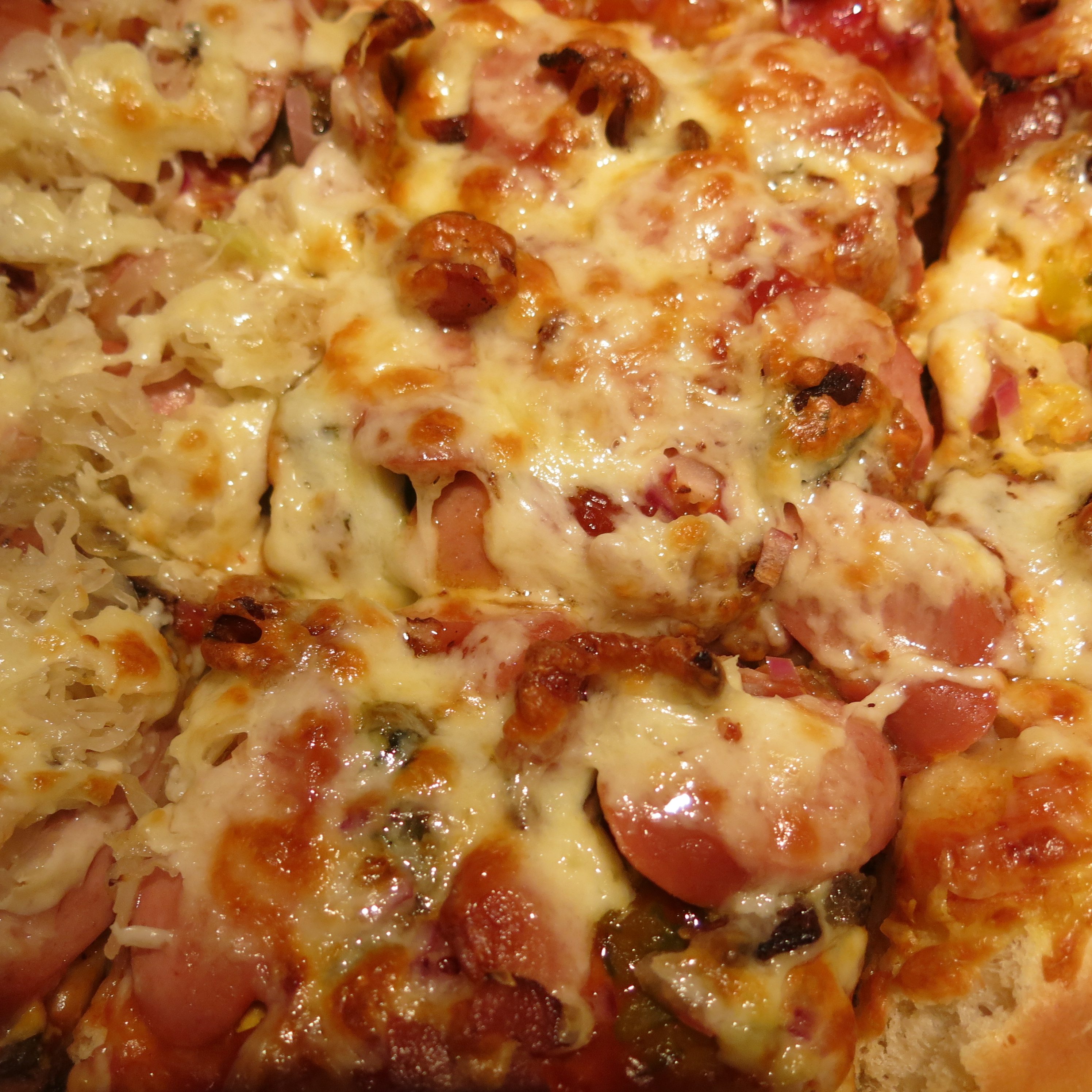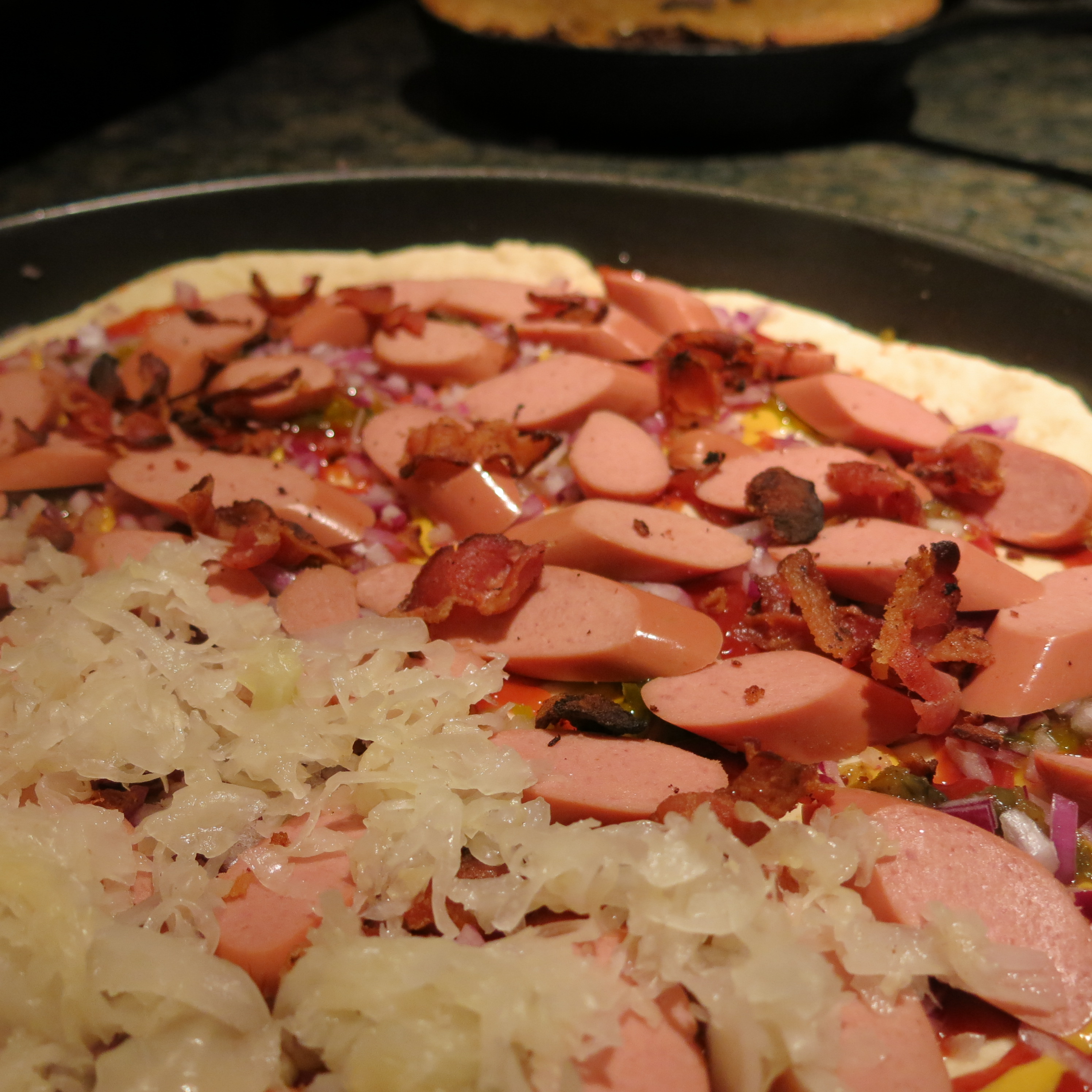This is enough for a 16-inch pizza. Place the crush in an oiled pizza pan. Squirt ketchup and mustard randomly over the crust up to about 1 inch from the edge. Drizzle on some sweet or dill relish. Randomly place some of the dry sauerkraut on the pizza and sprinkle the broken bacon pieces over. Place the sliced hot dogs reasonably close together over the entire pie. Sprinkle with the cheese.