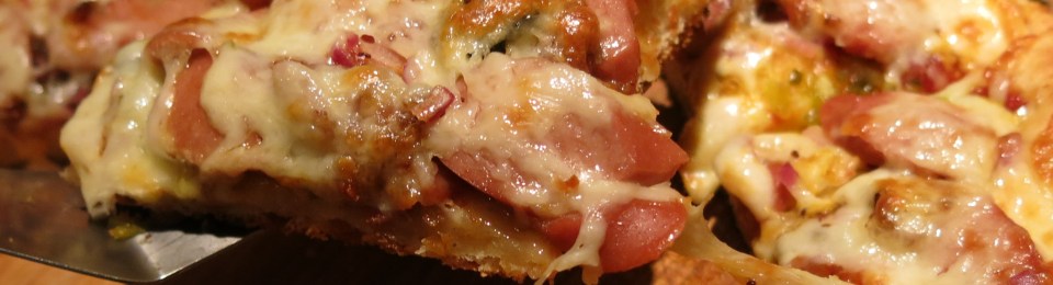I’ve given the list of ingredients I used, rather than specific amounts…use all of them, part of them or none of them. Use whatever you would normally put on a hot dog; you just simply put it on a pizza.