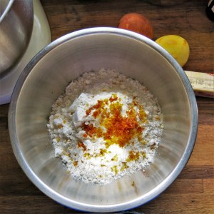 In a medium bowl, whisk together the flours, xanthan gum and citrus zests; set aside.
