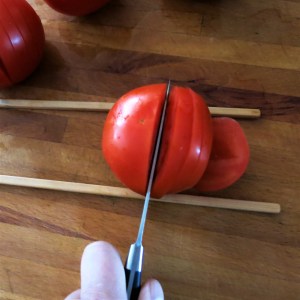 I cored the tomatoes as shallowly as possible, then turned them upside-down and cut them, into roughly 1/4-inch thick slices, but not all the way through, about 5 slices. Whenever I hasselback anything, I use chopsticks as a “stop” for the knife. You can hasselback almost anything—potatoes, sweet potatoes, carrots, eggplant, plantains and tomatoes. My next hasselback adventure will be with eggplant, I think.
