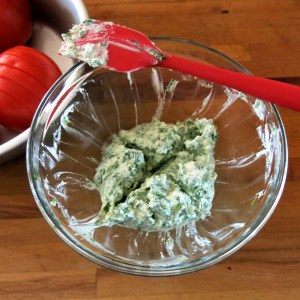 NOTE: I think it would be a good idea to place each cored tomato, cored top-down on a slice of French-type bread. Bake as suggested. This would allow the juices to absorb better. It’s a thought!