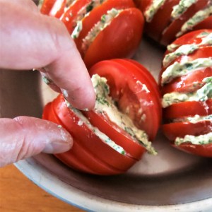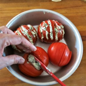 Hasselback Tomatoes with Basil-Mozzarella Filling Recipe©Marcia Lahens 2019. All rights reserved.