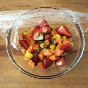 I like a combination of basil, orange mint and lemon balm, cut into a chiffonade; about 2 tablespoons total, maybe even a bit less. And I toss in some snipped chives, too. If you’re a fan of cilantro, this is lovely with a combination of cilantro, mint and chives. The key here is, ‘less is best’. You want the fruit to be the forward flavor.