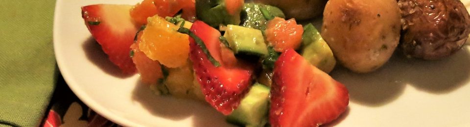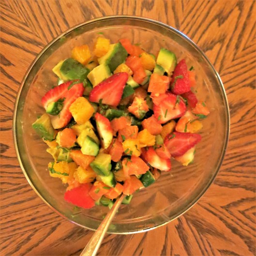 It is best to combine the strawberries, oranges and herbs a couple of hours before dinner, give it good toss, cover and chill. Then just before you’re going to serve it, dice the avocado and cucumbers, the juice of about 1/2 a lemon, toss and that’s it.
