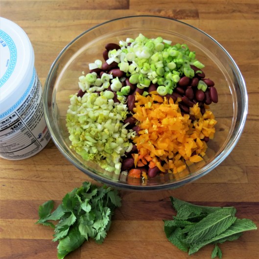 Celery, corn kernels, fresh cilantro, fresh ginger, fresh mint, Greek-style yogurt, kidney beans, mini-bell peppers, pomegranate molasses, Scallions, Spices