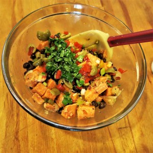 This salad goes together rather quickly. I bake the sweet potatoes in the microwave just until they can be pierced, but still have a bit of resistance. They will continue to cook and be the perfect doneness when they cool. I use two large ones, but you can adjust the ingredients to your liking. I use about 2-3 cups of diced sweet potatoes.