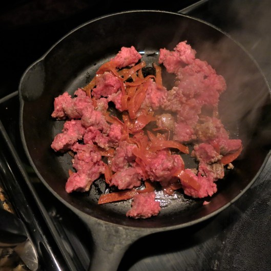 Sauté the pepperoni and burger “chunks” in some olive oil in a cast iron skillet. Use any stove-to-table pan, but cast iron does work very well.