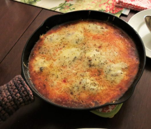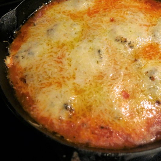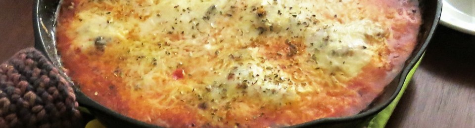 What? Has The Goddess been smoking herbs again? You might think that, but this came to be because she forgot to make pizza dough. And anyway, this is pretty much pizza, cooked in an oven-to-table pan, finished in the oven and served with good Italian bread to scoop up all that yumminess. So, it’s pizza, without a crust. You know what my memory is like. I had intended to make pizza dough, but as I’m well down that road to Hell, my intentions don’t always pan out. It turns out, this is actually really good. It makes a terrific mid-week meal. Kids love it, and that’s always a good thing. They can even make it themselves. It’s perfect game-day, in-front-of-the-TV food and you can actually do this on the BBQ, if you don’t want to heat up the kitchen. It’s rather nice, after a long, hot day, when the night temperature is bearable, to sit outside and enjoy this hot off the BBQ, with some good focaccia. It’s fast. But, most importantly, it’s delicious.