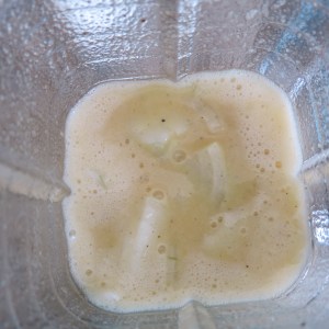 You pretty much dump everything, but the oil and poppy seeds, into the blender, and whirl it up. Then, remove the center from the lid. With the motor running, pour the oil though the hole.