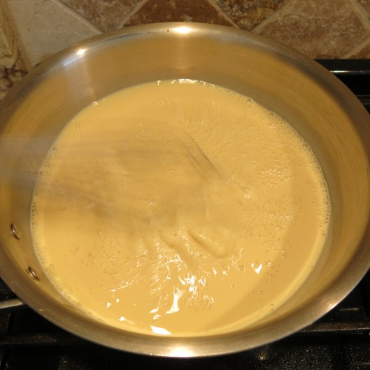 Whisk it all up, place the pan over low heat and whisk constantly, or at least very frequently, until you see some steam rising and the mixture thickens.