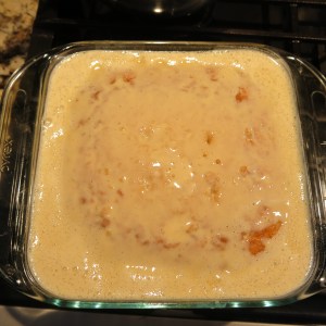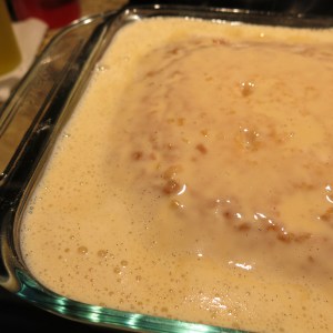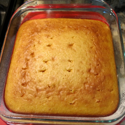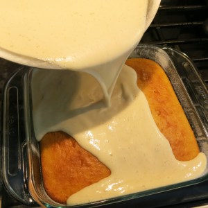 poke holes in the cake. I use a two-tined fork or a skewer. If you’re going to serve the dessert in “scoops”, then if you very gently make a few cracks (maybe 3 or 4) in the cake, that isn’t entirely a bad thing. It will allow the tres leches custard to seep into the cake more quickly and easily. If you are intending on cutting the dessert into squares, then stick with the holes only. I also run a table knife around the edge to loosen it from the pan. By the way, you should have your cake in the dish you intend to serve it from. When your custard is perfect and still hot,