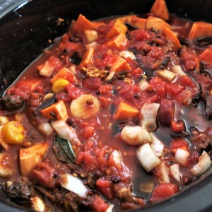 As you know, The Goddess does vegetables, but not really into the vegetarian thing. She loves her burgers, chicken and pork! But, sometimes a person needs to get outside their little world and wander a bit. This is what happens when she wanders off the beaten path….Don’t get me wrong, she does love vegetables. And she’s been into sweet potatoes recently. You know, they’re sweet and they’re potatoes, which in her book is a win-win! Well, truth be told, this came to pass as part of the “purge” of her pantry and cupboards…except for the fresh veggies, this was all from her cupboard. And the slow cooker was still out, from the Spicy Asian Short Ribs, so she thought this presented an opportunity. It’s getting to be that time of year, when you want warmth and comfort. Which, was what she wanted, when she made this, while she packed and tossed. She’s very glad those days are behind her, but she’s very happy to make this again and again!