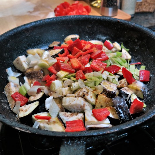As I wandered through the garden, I found some lovely Carmen red peppers. These are sweet pepper, not hot and just the most gorgeous red. But you could certainly use any bell pepper. I used a leek, instead of the more traditional onion and a variety of pear, plum and cherry tomatoes. And of course, eggplant. This is a much faster version to prepare than the traditional version; it took about 20 minutes from start to finish.