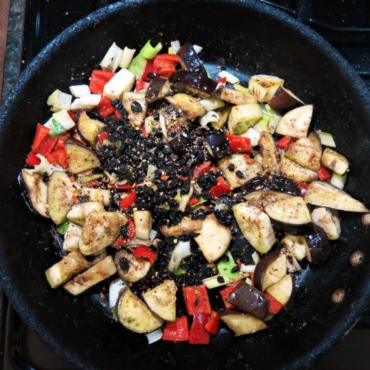 I prepared the eggplant using the cornstarch dusting like we did in the Lebanese-Style Eggplant with Tomatoes, Garlic and Mint, so I won’t repeat how to do that. Just go there and check it out. I just barely browned the eggplant chunks, as I wanted the eggplant to retain a good bit of its texture, so it wouldn’t be mush at the end. I always leave the skin on the eggplant, but remove it if you prefer.
