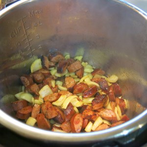 Pick the beans over, removing any small stones or dirt and damaged beans.  Rinse and set aside.  If you have an InstaPot, then sauté the kielbasa in the pot, until it begins to caramelize and brown; toss in the onion.  Remove to a dish; set aside.
