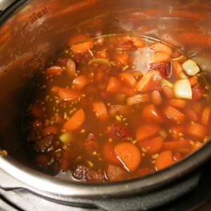 The Dynamite Doula, a young woman who is near-and-dear to us, invited us over for lunch.  She has a new “InstaPot”, the pressure cooker-sauté pan-slow cooker pot and a whole lot more.  It turns out we have the same one, kindred spirits that we are!  Anyway, she, and her Dear One, served us a version of this wonderful, rib-sticking, winter-chasing bean soup.  It was supremely delicious, The Spicy Honey loved it and so I decided to see if I can come close to repeating her soup.  NOTE:  Originally, I omitted the info for adding the tomatoes, but I have corrected that in the recipe.  You add them with the carrots.