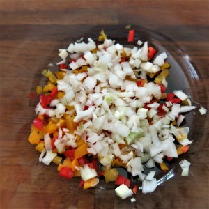 Drain the green beans very well. Cut across into about 3/4-inch pieces. Place in a bowl, with the drained legumes, onions, bell peppers, celery, and radishes. Toss to combine.