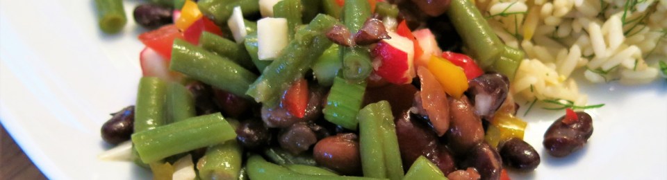 For the salad, place all the salad ingredients in a bowl. Place all the vinaigrette ingredients in jar with a tight-fitting lid. Now shake the jar like crazy, for at least 30 seconds. Pour the vinaigrette over the salad, give everything a good stir and then taste. If you want a sweeter salad, drizzle some honey over the salad and re-stir. Cover and chill for at least a couple of hours, or overnight. My mother always made the vinaigrette the day before she was going to use it. I think it was because she wanted the sugar to be dissolved, but I don’t find that to be an issue. Stir before serving. You can add minced parsley or fresh basil, but I still prefer this salad just like like it is. This a great salad to tote places. I think you’ll like this version of bean salad.
