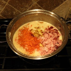 carrot, dry chicken base, Ham, heavy cream, leftover mashed potatoes, Scallions, shredded cheese