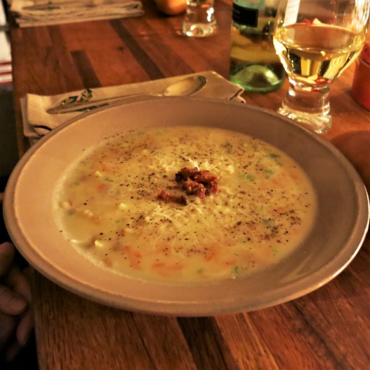 Honestly, I really had been thinking about potato soup today. I had leftover mashed potatoes, with just a bit of parsnip in them. This is a perfect situation to make a soup. I had some ham, a couple of slices of jamón Iberico, a few leftover roasted baby potatoes, and I shredded up a carrot. You can see the “roots” of a soup, can’t you? This pretty much just fell together. I only had about 3/4 cup mashed potatoes, so I added some dry potato flakes, to round it out.