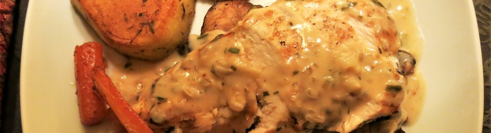 I served pan-seared, then roasted chicken breast on a bed of sautéed mushrooms and drizzled the sauce over and around the chicken, with Creamy-Crispy Potatoes and Brown Butter-Honey Glazed Carrots on the side.