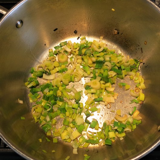 Sauté the leeks in olive oil for a few minutes. I use some of the more tender, inner green parts of the leeks, too. Why waste them?