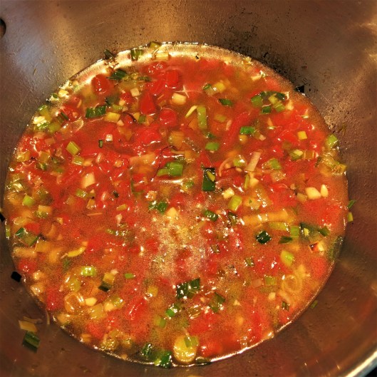 In a large deep frying pan, heat the oil over moderate heat. Add the leeks, sprinkle with salt and cook, stirring occasionally, until the onion is soft, about 4-5 minutes. Stir in the garlic, roasted peppers and sherry (with the saffron threads); simmer for 1 minute. Add the fish broth (I use the reserved pepper “juice” as part of the liquid). Bring to a simmer, reduce the heat and simmer gently, covered, for 10-12 minutes. MAKE AHEAD TIP: You may remove the pot from the heat; let stand for 2-3 hours before you finish the dish.
