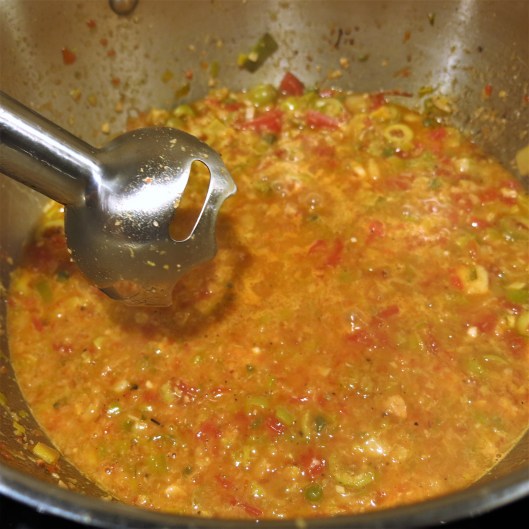 NOTE: Before you add the olives and capers, you may wish to thicken the sauce, which tends to be a bit on the “watery” side. I use an immersion blender and blend one side, or about one third of the entire amount of sauce. I like to leave the remainder unblended, as I like the chunkiness. You may also thicken the sauce with a cornstarch slurry. Thicken, then continue with the recipe.
