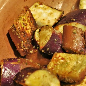 As you know, The Goddess has that lazy streak that rear its ugly head from time to time.  So, I make falafel with a mix.  There.  I said it out loud.  I do add a few little “improvements”.  But, I love to use the mix to coat fish, like I did with the Falafel Coated Snapper.  It’s yummy stuff.  Anyway, I bought some Asian eggplant and had just a bit of the mix left and God forbid that I would just simply pitch it out.  Normal people do that.  The Goddess detests wasting things.  I think it comes from having parents who experienced the Great Depression.  That’s my story and I’m stickin’ with it!