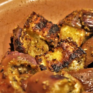 I cut the eggplants in half lengthwise, then across into about 1-inch pieces.  I decided to coat the eggplant pieces with a bit of olive oil, then the falafel mix.  I pan-fried them with just a bit of additional oil and at the very end, a nice drizzle of pomegranate molasses, which honestly, was an afterthought.  It turned out to be a good thought.  I’m happy to report, this is a keeper.  Don’t you just love when that happens?